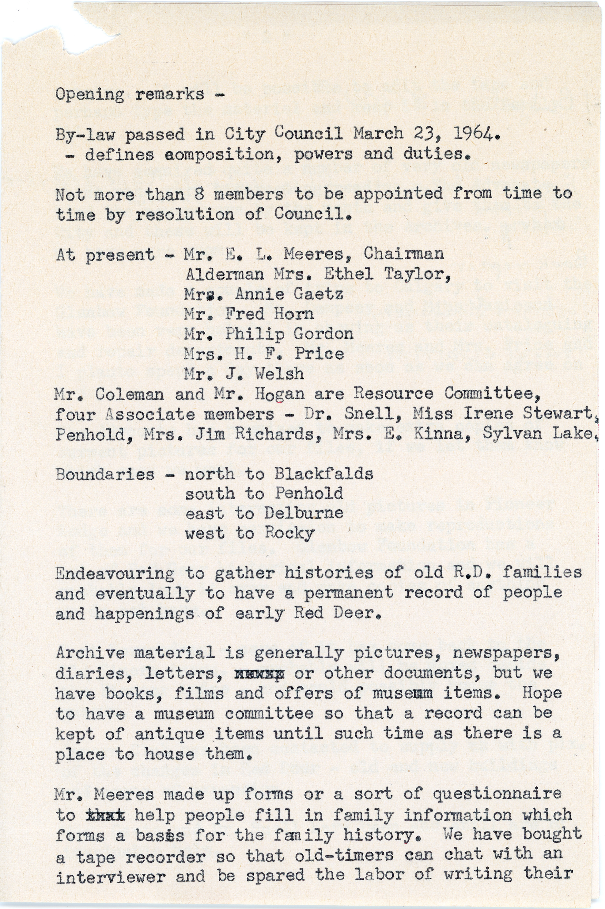 By 1963 the subject of the Archives and an Archive Committee was presented to Council by Taylor. The passing of By-law No. 2172 on March 23, 1964 brought the Archives into official creation. Made up of seven community members appointed by Council and one Councillor, the group would act in an advisory capacity to City Council and begin collecting and managing the historical documents of the community. The founding committee included Councillor Ethel Taylor, W.H. Edgar, T.H. Edis, Thelma Foster, Annie L. Gaetz, Ted Meeres, H.J. Snell, and Fred Turnbull, with Thelma Foster hired as The City’s first Archivist.