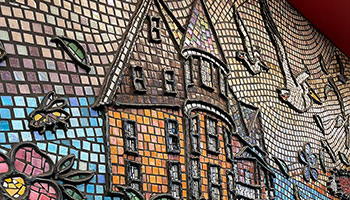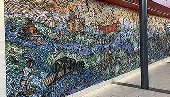 This mosaic is a vibrant layout of Red Deer's architectural icons, plants and animals found in and around Red Deer. It invites you to play "I Spy" just to try to find as many of them as you can!