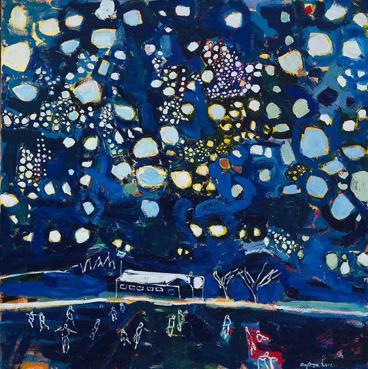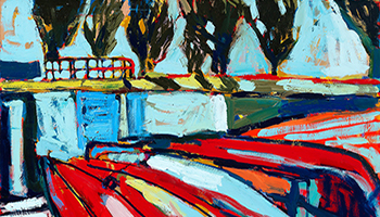The paintings move through time: from the summer boats on the lake, boldly red, suggesting feelings of anticipation and adventure on a sunny summer day; to the patterns of the stars, twinkling from within the midnight blue sky; to the white winter ice of the ponds, then back to the patterns of the stars again. This painting and print series is indicative of the visual textures that one would find in and around the Bower Ponds Pavilion. The sky pieces prompt the idea of a complex interconnection that holds all of the other textures and scenes together.